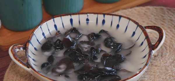 步骤②:接下来是讲解泡木耳的方法,一把木耳放到大碗里,加入一勺白砂糖和一勺面粉,和泡腐竹一样倒入不烫手的温水,然后搅拌均匀泡5分钟,5分钟后木耳泡发了在用清水冲洗一遍,可以看到这样泡的腐竹非常干净。