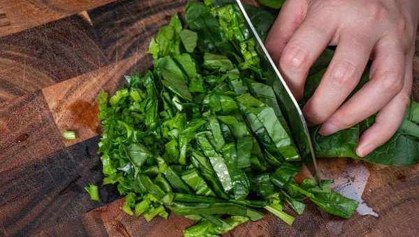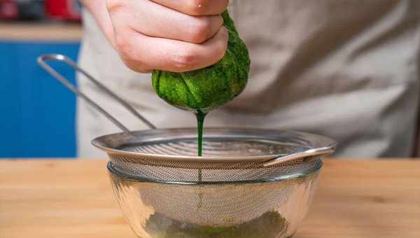 3.菠菜去梗留菠菜叶切碎,塞入果蔬机中,倒入30g清水,按果蔬键2次搅拌成菠菜汁,用纱布过滤出30g菠菜汁备用