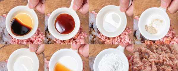 2.大碗中倒入猪肉末、虾泥、盐、糖、生抽、蚝油、黄酒、白胡椒粉、红薯粉用筷子搅拌上劲备用(大概搅拌5分钟左右)