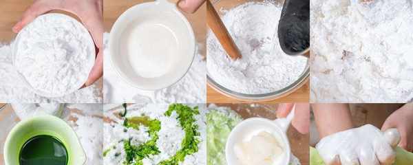 4.将澄面、马铃薯淀粉、盐倒入耐热的大碗中搅拌均匀,一边倒入沸水一边用擀面杖搅拌均匀,趁热倒入菠菜汁,下手揉至面团成型后加入猪油,将面团放在案板上揉至光滑,搓成长条分成大小相等的剂子(约22g/个),盖上保鲜膜防干裂