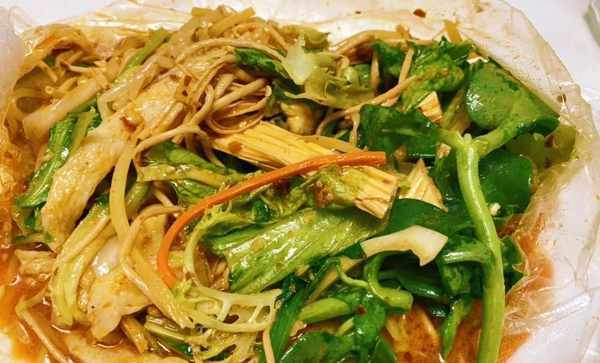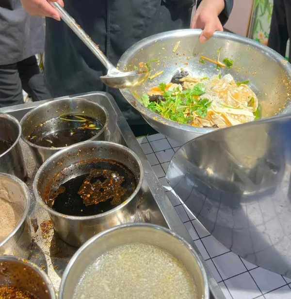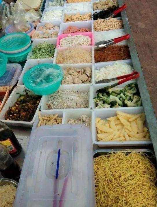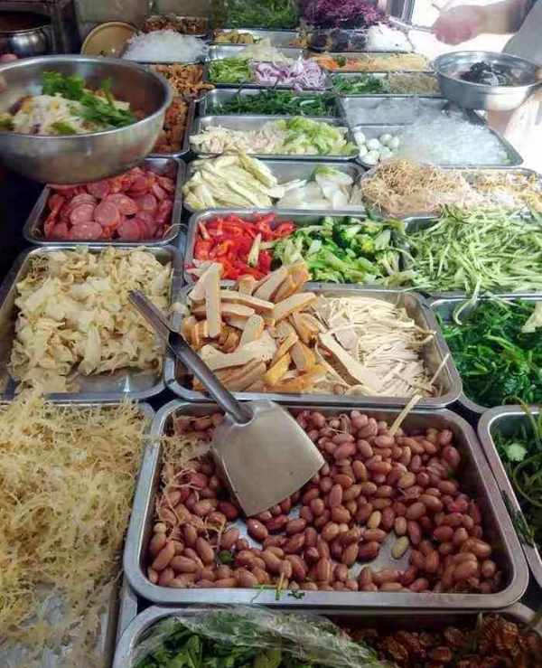 大盘子里夹入自己喜欢吃的菜,然后等着老板往里面加入各种调料,哗哗地搅拌起来!