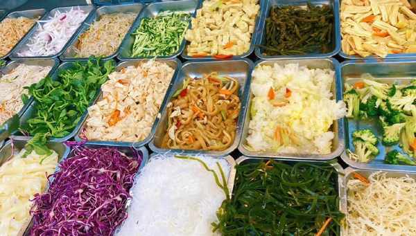 各式各样的菜品看起来五颜六色的,光是看着就让人觉得舒服。这些菜都是烫煮过的熟菜,看自己喜欢吃什么拿什么就可以了!