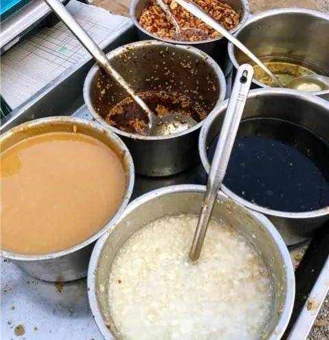 拌凉菜用的盆子比选菜的盘子更大了一些。调制凉菜的各种调料也放在摊位上,蒜汁、辣椒油、香醋等,最后还会放一些香菜提味,这些东西都加入大盆子后,就看见拌菜的师傅如行云流水般似的,将大盘里的菜充分的搅拌起来,让每一个菜都充分的吸收了汤汁后,一份凉拌菜就好了!