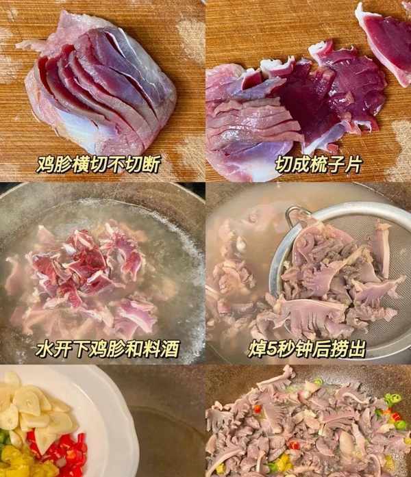 ❶先把鸡胗子洗净,再如上图改刀再焯水备用。