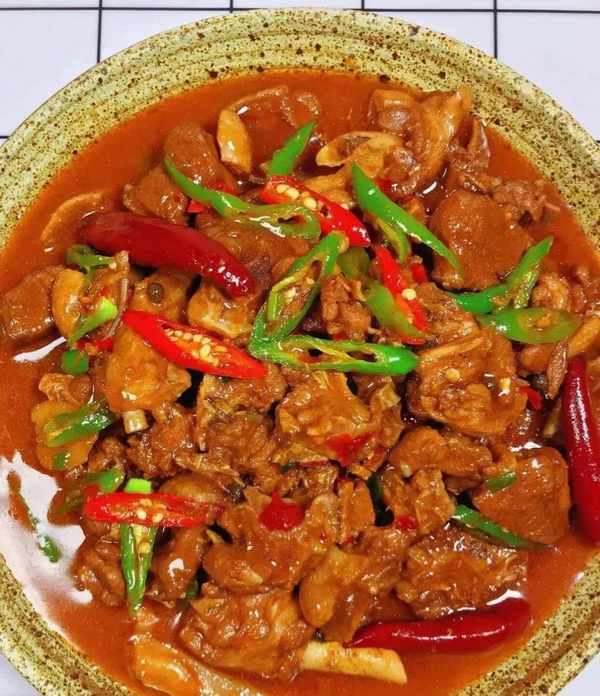 起锅烧油,多放点油,待油温六成热时,如上图放入腌好的鸭肉煸炒几分钟,再放入调料炒出香味,然后在加入啤酒、冰糖和水,大火烧开后转至小火慢炖四十分钟左右,最后放入小米辣、小葱花、青椒和味精,大火翻炒均匀,收汁出锅即可。