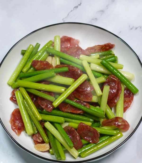 锅烧油,葱花爆香,然后放腊肠炒出香味,再加入盐味和少许水,翻炒均匀,最后勾芡翻炒出锅即可。