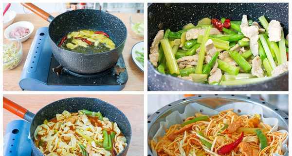 12、蒸面条的时间我们刚好来炒菜,起锅倒油,油热下生姜大蒜干辣椒爆香,然后把肉片加进来炒,肉不用炒太久,容易老,炒至发白即可,这样比较嫩;