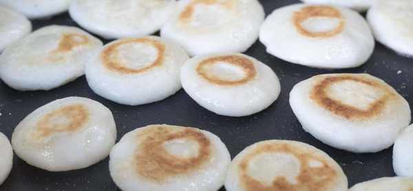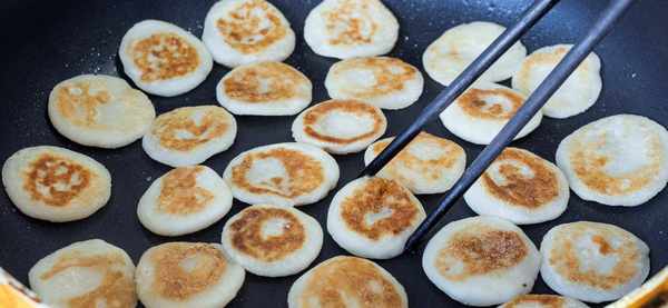 6、接着盖上盖子再继续小火烙3分钟,全程小火慢慢烙,烙到两面金黄,小饼微微膨胀就可以出锅了,香甜软糯的山药小饼就做好了
