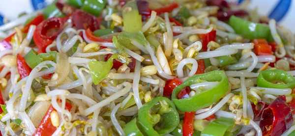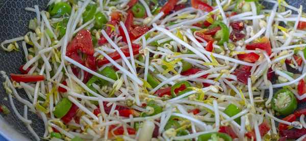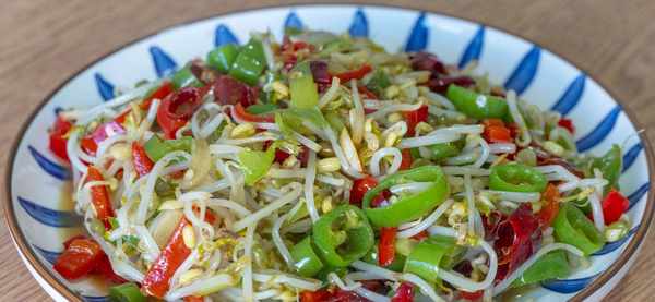 6、我们家是比较爱吃辣椒的,就算是清炒豆芽也是要放辣椒的,绿豆芽比较容易熟,炒两分钟后简单地调个味儿后就可以了,盛出来就可以开吃了。