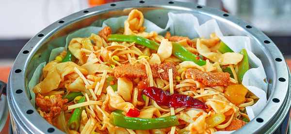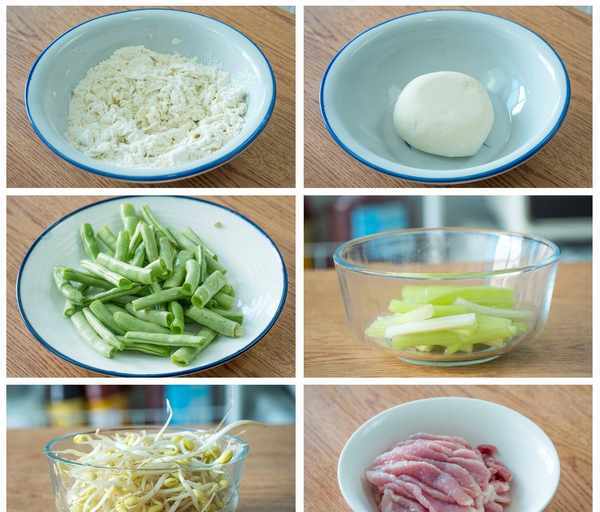 配菜:豆角150克、芹菜1颗、黄豆芽100克、猪肉180克、食用油适量、老抽2勺、生抽1勺、豉油2勺、盐1勺、十三香半勺、胡椒粉半勺、香油1勺、豆芽适量