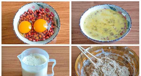 2、泡好的红豆中打入2个鸡蛋,用筷子搅散,倒入料理桶中,再加100毫升清水,用料理棒打成红豆浆;
