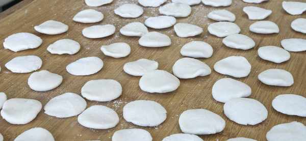 4、揉好后取出来移到砧板上,然后先揪1小块儿面团儿,先用掌心搓圆,再用手掌压扁,小面饼的生胚就出来了,面饼做小一点不仅好看还更容易熟,全部做好后再撒点糯米粉防粘;
