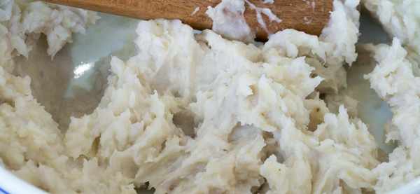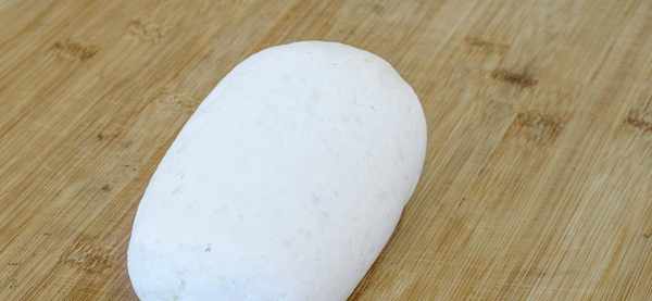 3、接着我们往山药泥里面加糯米粉,少量多次地加,拌匀后直接上手揉面,然后再根据面团儿的软硬程度加糯米粉,直到能揉成一个软硬适中且不沾手的的面团儿;