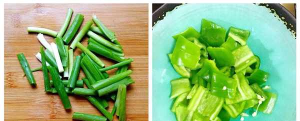 2、准备配料:香葱洗净后改刀切小段,青椒去根去籽,洗净后改刀切块;