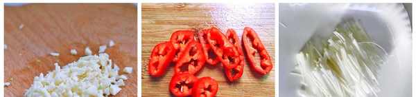 3、大蒜去皮洗净切沫,小米椒切圈、大葱切细丝;