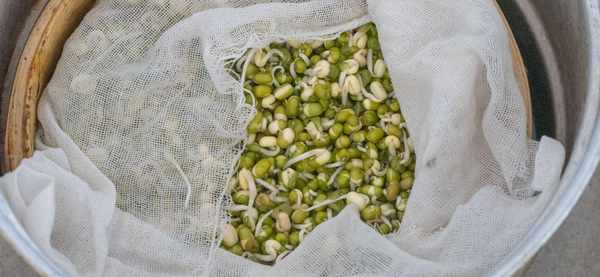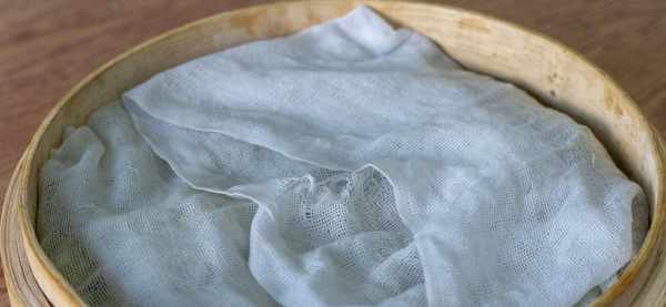 2、接着准备一个可以滤水的筐子,我是用的小蒸笼,先铺上一层干净的纱布,豆子倒进来后再铺平整。