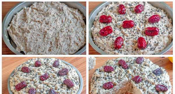 5、准备一个模具,刷上一层食用油防粘,倒入面糊,用筷子和锅铲将其摊平,再撒上一点黑芝麻,放上几颗红枣,放入蒸笼中2次醒发20分钟;