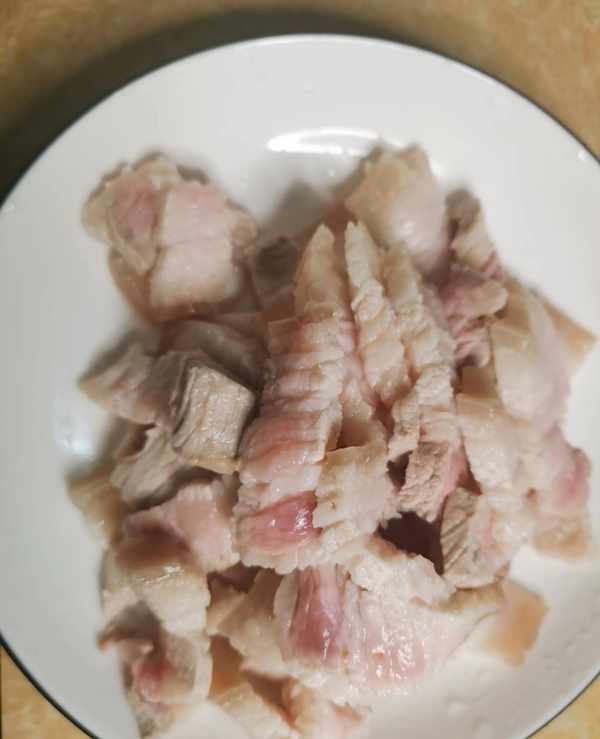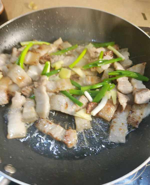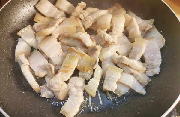 炒锅倒油烧热,放入五花肉片,炒至吐油。