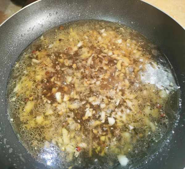 锅中添入清水,放冰糖炒至变成红色,在加适量水制成糖色汁,倒出备用。