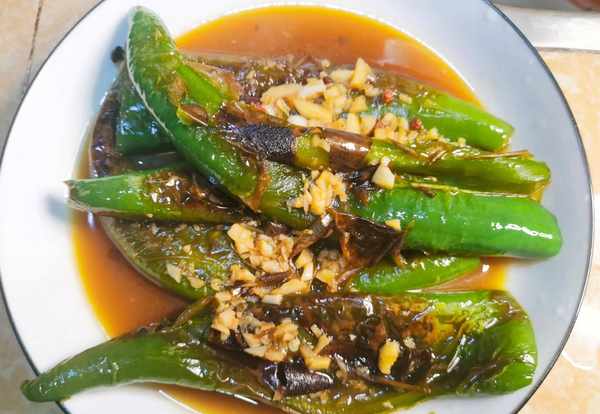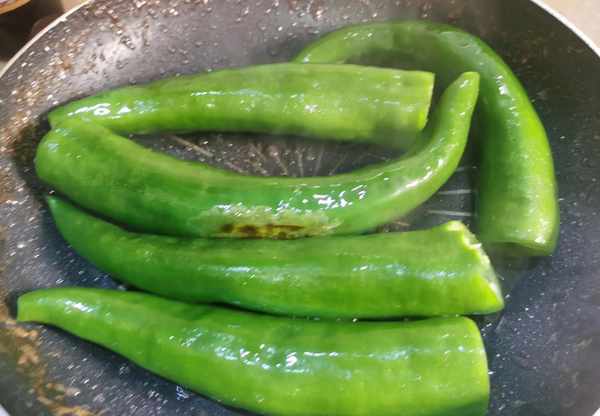 锅中倒点油,放青椒煎至虎皮状,捞出。
