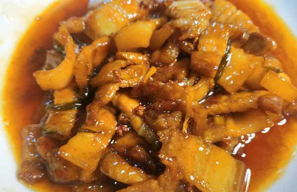 放酱油(生抽)、糖色汁、醪糟汁,继续煸炒,至红色,汁浓时,装盘即可。