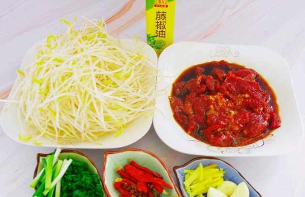 【烹饪食材】:牛里脊肉250克、玉米淀粉3勺、蚝油1勺、蛋清半个、葱2根、蒜瓣3个、花椒10粒、豪吉藤椒油1勺、料酒1勺、生抽1勺、食用油1勺、豆芽250克、姜丝5克、干辣椒5克、熟白芝麻2克、清水两碗、火锅底料50克、花生油15克。