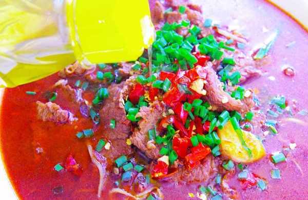 7、牛肉煮熟后捞出放在豆芽上,然后把锅中的汤汁也倒进容器中,再把切好的葱花撒在菜品上,放上干辣椒、花椒、白芝麻和藤椒油即可。