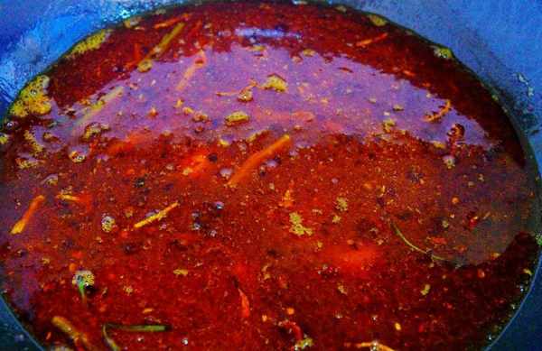 4、继续加入一小块火锅底料,小火炒化后加入适量的清水,盖上锅盖后大火煮开锅。