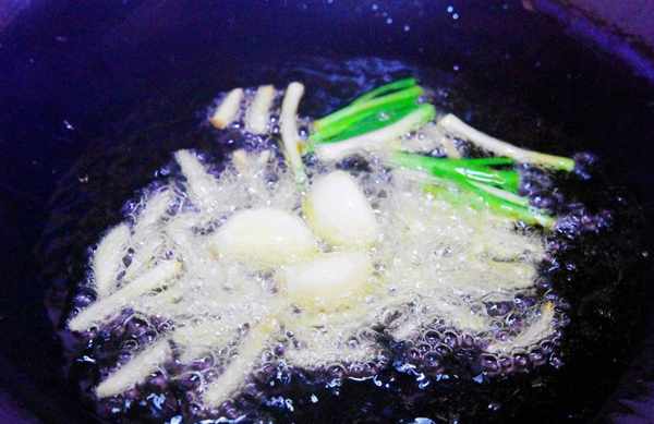 3、锅中加入少许食用油烧热,油温升高后把切好的葱姜蒜倒进锅中,翻炒出香味。