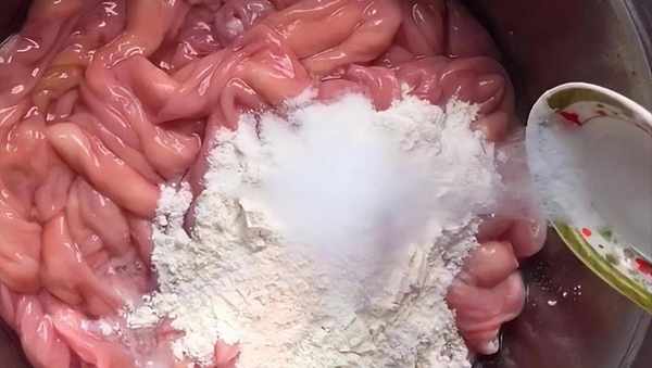 我们去市场买来两斤猪小肠,先来处理一下,把小肠表面的这层油脂用手拽干净处。放入瓷盆中加入食用盐和淀粉清洗干净。