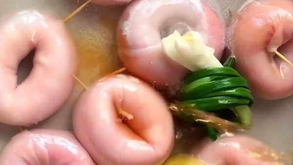 锅里加入凉水、葱段、姜片、放入料酒去腥,我们把圈圈肠焯一下水,焯好以后去掉牙签备用。