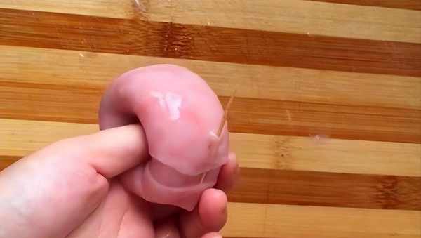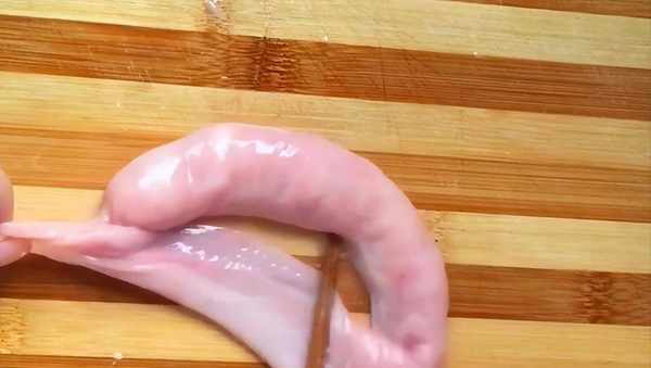 处理好以后用筷子顶住一头,然后这样慢慢地把小肠穿过来,给小肠做个翻身的动作。