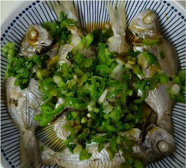第二个菜是清蒸小鱼,没有选择什么大一点的鱼,因为价格会贵许多,这种小鱼其实除了刺多一点,肉质却不输大鱼,肉嫩而没有异味,吃起来很鲜美,简单地处理掉内脏,然后蒸六分钟,因为鱼比较小,蒸的时间比大鱼短,蒸好之后撒上青椒沫,然后淋上一点热油激发香味,一点蒸鱼酱油提味,就可以了。吃起来肉嫩而咸香入味,鲜美回肠。