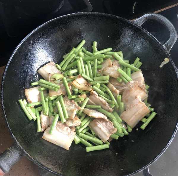 3.第二次蒸面条期间,取五花肉切成大片,长豆角切成条,葱姜蒜切成片。锅内热油,倒入葱姜蒜爆出香味,放入五花肉煸炒至变色,水汽炒干、表面微焦的状态,放入长豆角翻炒一分钟至断生。