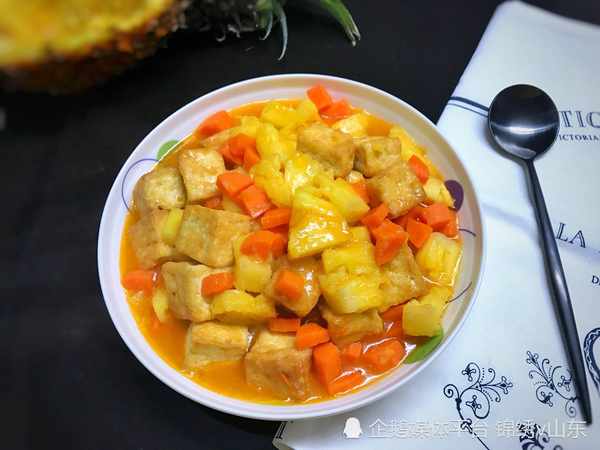 【食材】:菠萝 1个、老豆腐 适量、黄瓜 适量、番茄酱 4大勺,料酒1勺、白糖 1勺,盐 1小勺,玉米淀粉 适量,