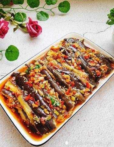 4、炒锅放少许油,倒入蒜末和小米椒炒出香味,倒入蒸茄子时盆里的水,放入生抽、香醋、食盐、白糖炒匀,将炒的料汁淋在茄子上就行了。