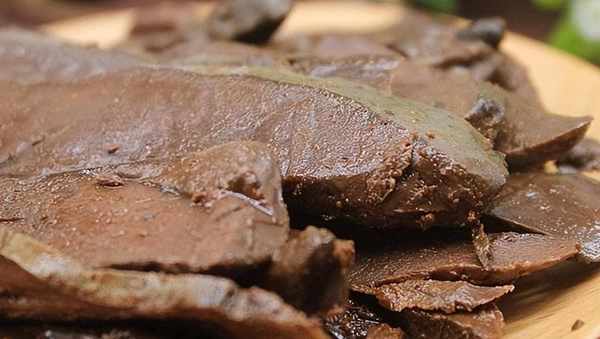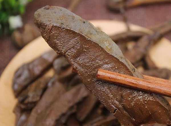 选用新鲜的猪肝和猪胆放入高浓度的盐水中浸泡,然后取出晒干。制作出来的猪肝里面已经被胆汁渗透,外形美观,颜色匀称。拿起一块猪肝放入口中,瞬间便能感受到其苦中带甘,微甜香嫩的口感,风味非常独特。