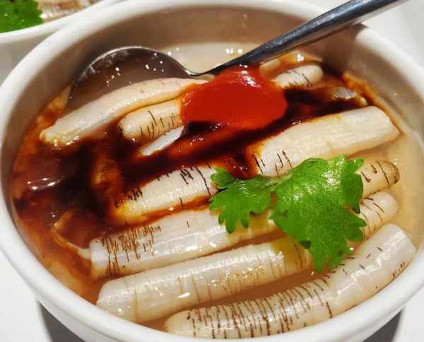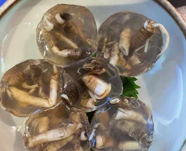 出锅后的土笋冻先静置一段时间,然后蘸上由酱油、蒜泥等调配而成的酱料,一入口,你便能感受到其魅力,果冻一样的口感配合咸香的蘸料,实在让人难忘!土笋冻里面的沙虫非常鲜脆爽口,并没有什么怪异的味道。