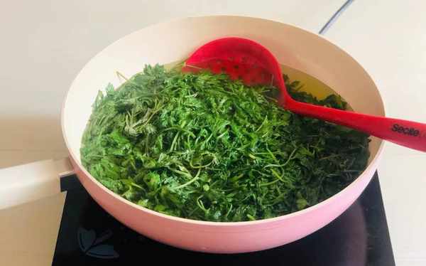 3、烧一大锅的热水,先加一小勺的小苏打,没有的可以放一点点的食用碱搅匀,接着把艾草放到大锅里,煮一分钟左右,艾草的质地变软,这时候立即捞出来。