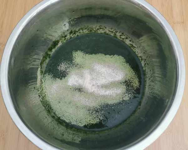 1、首先来准备一些艾草,焯水之后,放到料理机中搅碎,可以过滤出碎渣,但是不过滤也无妨,口感更自然。根据你的面粉用量,准备出适量的艾草汁,500克面粉的话,对应250毫升的艾草汁,当然其中是可以加水的,放入相应的酵母,白糖搅匀。