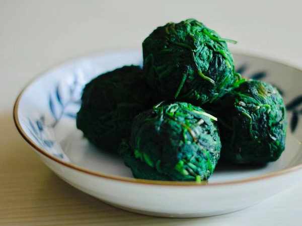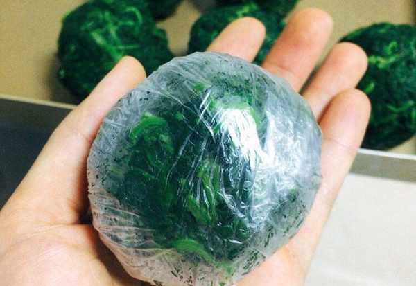 5、接着将艾草从冷水中捞起,将水分挤出,但是也要注意力度,不要太大,以免将艾草挤烂,然后将艾草分成小份整理成圆形。