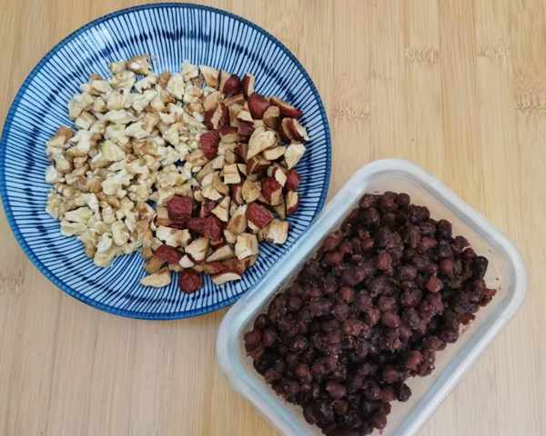 3、在等待面团发酵的时候,我们来准备一些馅料,红枣,核桃仁(最好炒熟),红豆需要提前煮熟,然后拌入红糖调味。