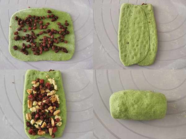 5、进入塑形这一步,取一个小面团,首先擀成长方形,铺上一层红豆,从两边对折到中间,包裹住红豆,压实并轻轻擀薄,再放上一些红枣核桃仁,接着卷起来,要适当紧一些,以免果仁散落出来。