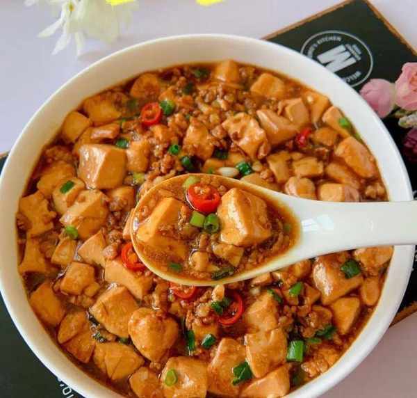 (3)锅中放油,放蒜末,姜末,放肉沫炒香,放豆腐加二勺生抽,一勺老抽,一勺蚝油,少许盐,轻轻晃动锅,让豆腐和肉沫入味,淋入淀粉水收汁,撒上葱花和小米辣即可出锅。