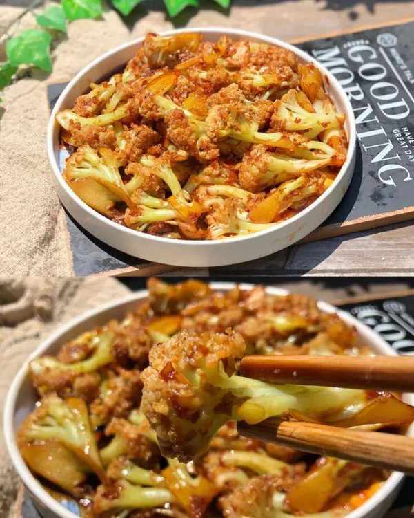 (1)花菜撕成小块清洗干净备用,大蒜剁成蒜泥,锅中放入适量油,加入蒜末炒出香味,放入花菜翻炒至断生。