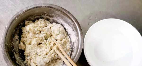 然后用筷子搅鸡蛋和面粉,向里面加少许水,搅拌成大面絮。