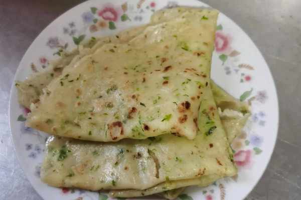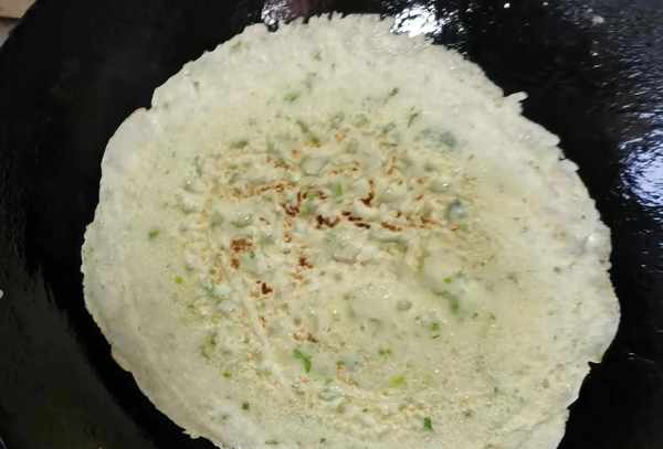 搅好了面糊,你还可以往里面放一点儿胡萝卜末或者韭菜末来摊。摊之前一定要挑一滴面糊尝尝咸淡如何,味道可以了再做,否则你的煎饼不是淡了,就是咸了。