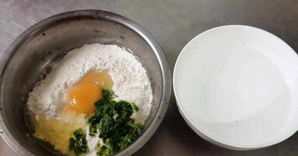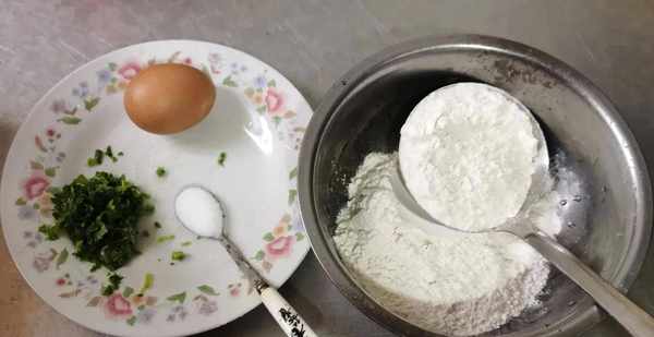 准备食材:面粉两勺,鸡蛋一颗,食盐一汤匙,一点儿青菜末,一大碗水。