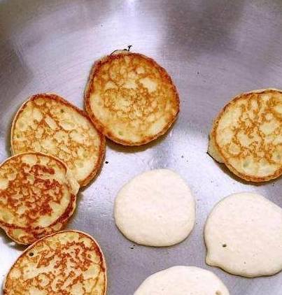 用小勺在距离锅15cm处自由滴落面糊,这样做出来的面饼比较圆滑有型、薄厚适中