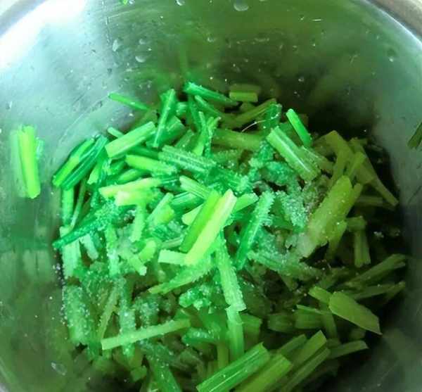 2、切好的芹菜放入一个碗中,碗中放入一勺左右的食用盐,充分搅拌均匀,腌制大约15分钟。15分钟以后,将碗中多余的水分倒出。